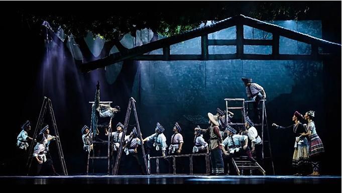“花腰帶”既是精美的舞蹈道具,又是劇中人物情感的寄托,在整部舞劇中反復出現(xiàn)。特別是在雙人舞中,“花腰帶”將人物間無形的關系幻化成有形的聯(lián)系。劇中的蘆笙舞段,不僅僅是男女之間情愛的表達,更突出表達了“開山人”為了讓窮鄉(xiāng)告別貧苦,為大愛舍小愛、努力奮斗的決心,以及對美好生活的向往。傳統(tǒng)民族舞蹈在這部劇中被賦予了不同的含義。