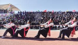 2020年11月29日,為期三天的西藏自治區(qū)山南市扎囊縣首屆農(nóng)民運(yùn)動(dòng)會(huì)在扎囊縣體育公園進(jìn)行。抱石頭、套麻袋、氆氌纏線等多項(xiàng)趣味十足的運(yùn)動(dòng),吸引了來自扎囊縣5個(gè)鄉(xiāng)(鎮(zhèn))、62個(gè)行政村(居)的450多名農(nóng)牧民運(yùn)動(dòng)員參加角逐。每年冬季,雅魯藏布江流域的西藏農(nóng)村進(jìn)入農(nóng)閑時(shí)期,當(dāng)?shù)剞r(nóng)牧民就迎來了一年中難得的休閑時(shí)光。圖為農(nóng)牧民運(yùn)動(dòng)員在進(jìn)行拔河比賽。