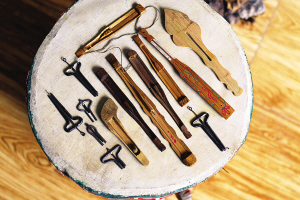 安宇歌介紹,口弦都是純手工制作的,最難制作的部分是能發(fā)音的中簧。制作中簧時,選取原料須是圓形鋼絲,先要將其砸扁,兩邊是尖的,整個簧的距離由寬到窄,窄的部位向上折彎成鉤,留兩公分長度,再折一小鉤。并且,中簧需高溫淬火,這是一個難度極高的環(huán)節(jié),全憑手感。如簧不淬火便會彈性不好,淬過了頭則一彈就碎,淬不到位會導致彈撥口弦時所發(fā)的聲音不佳。從某種程度上講,用口弦彈奏的音樂之所以引人側(cè)耳,關鍵就在這根中簧上。