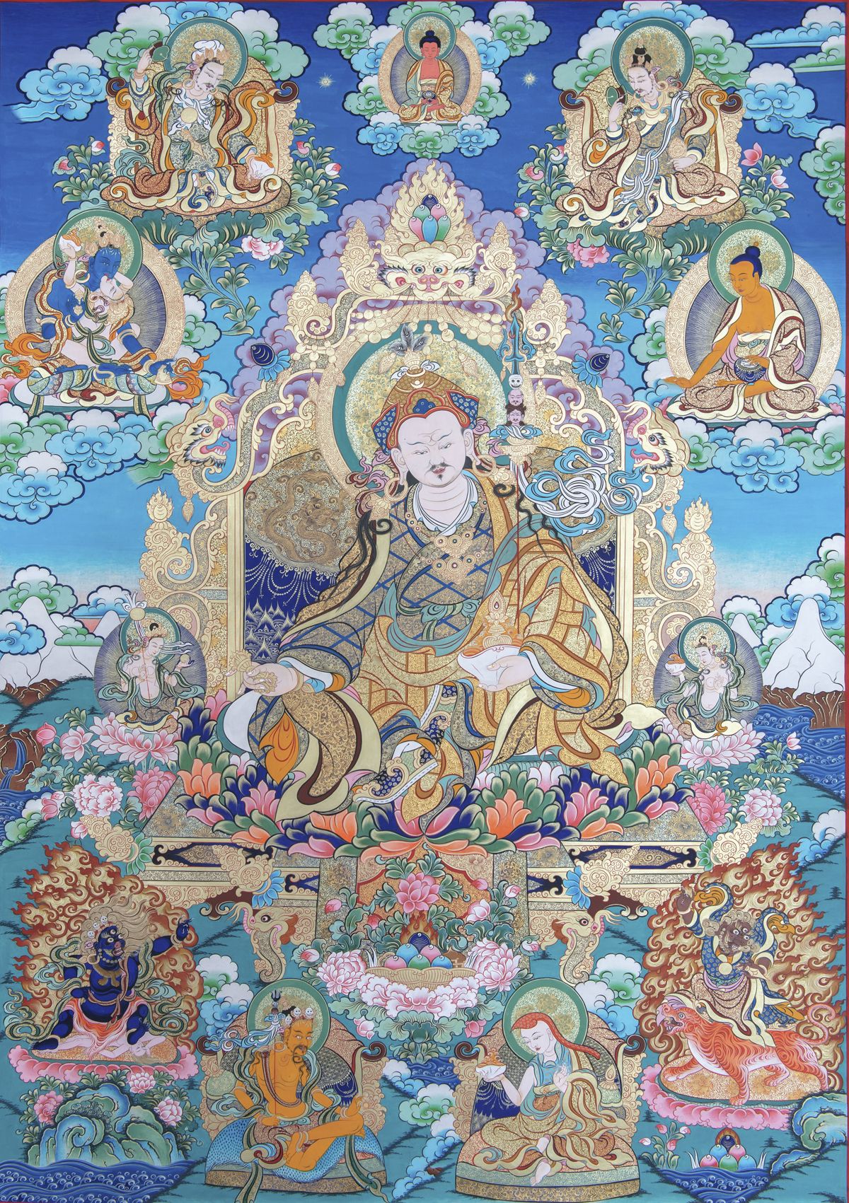 蓮花生大師,印度佛教史上最偉大的大成就者之一。公元八世紀(jì),應(yīng)藏王赤松德贊迎請入藏弘法,成功創(chuàng)立了西藏第一座佛、法、僧三寶齊全的佛教寺院——桑耶寺。他教導(dǎo)藏族弟子學(xué)習(xí)譯經(jīng),從印度迎請無垢友等大德入藏,將重要顯密經(jīng)論譯成藏文,創(chuàng)建顯密經(jīng)院及密宗道場,開創(chuàng)了在家出家的兩種圣者應(yīng)供軌范,如是等等,奠定了西藏佛教的基礎(chǔ)。藏傳佛教尊稱他為咕汝仁波切(意為大寶上師)、鄔金仁波切(烏仗那寶)。通稱貝瑪迥乃(蓮花生)。據(jù)多羅那他于1610年所著《蓮花生傳》所載,約于摩揭陀國天護(hù)王時出生于鄔金國王族。圣誕日:藏歷六月初十。