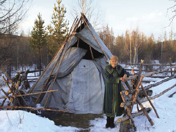 撮羅子的選址,是在地勢較高、陽光能照射到而且水和柴草就近可取的平坦之處。其蓋造方法,是用三五根約碗口粗細上有枝杈的木桿,相互交合搭成上聚下開的骨架,然后再用30根左右木桿搭在骨架之間捆綁固定,在南面(或東面)留出門,即基本成型。木桿搭起的只是“屋架”,外面還要覆蓋才能遮風(fēng)擋雨。按照季節(jié)的不同,分別用樺樹皮、草簾子和犴、狍等獸皮,做成自上而下一層壓一層的圍子,綁在木桿上,門簾則夏用草或樹條編,冬用狍皮做成。