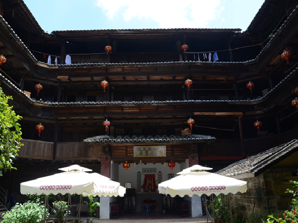 一座土樓就是一個(gè)藝術(shù)殿堂。每一座土樓,又如同一個(gè)“大家族,小社會”。土樓內(nèi),居住在同一屋頂下的幾十戶幾百人同祖同宗同血緣同家族,過著共門戶、共廳堂、共樓梯、共庭院、共水井的和睦生活。這種聚族同樓而居的生活模式,典型地反映了客家人的傳統(tǒng)家族倫理和家族的親和力。而且,樓內(nèi)的客家人,住著層數(shù)相同、開間面積相等、無明顯朝向差別、更無貴賤等級之分的均等居室。平等聚居,反映了客家人融洽和睦的家風(fēng)和平等團(tuán)結(jié)的傳統(tǒng)。