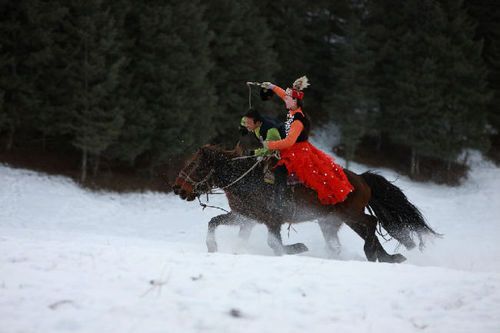 在傳統(tǒng)的竟技比賽場上,最激動(dòng)人心的還是“姑娘追”它往往是全場比賽的壓軸戲?!肮媚镒贰?據(jù)說是由上古“追姑娘”的風(fēng)習(xí)演變而來,至今既是哈薩克人最喜愛的娛樂項(xiàng)目,又是小伙子找對象談情說愛的好機(jī)會(huì)。