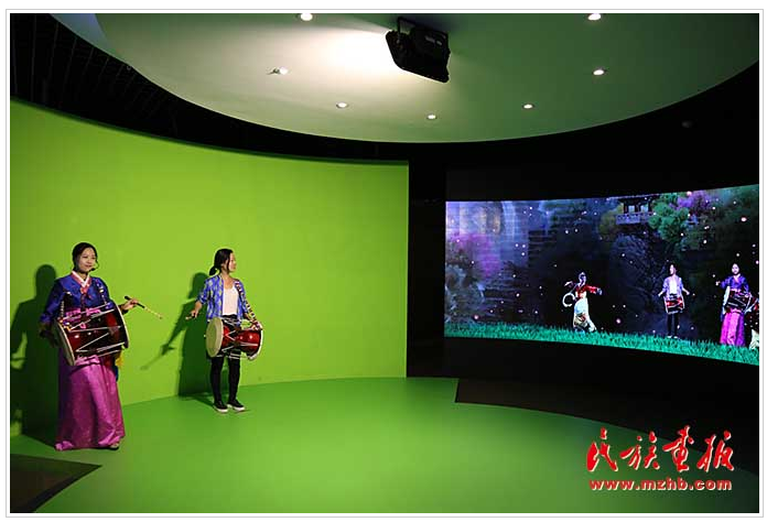在長鼓舞體驗(yàn)區(qū),參觀者紛紛走到長鼓前,隨著熒屏上顯示的節(jié)奏與動(dòng)作提示,體驗(yàn)長鼓舞的高雅飄逸,另一側(cè)大屏幕上,顯示出相應(yīng)的歌曲與舞蹈