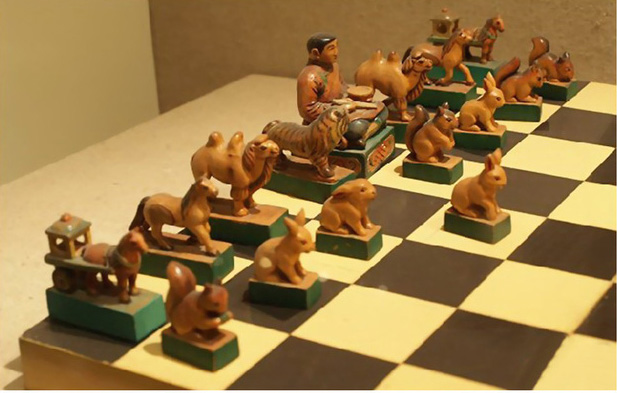 蒙古象棋棋盤,淺色的叫白格,深色的叫黑格,棋子也分白黑兩種,共32個(gè),雙方各有一王、一帥、雙車、雙象、雙馬和八個(gè)小兵。與國際象棋不同的是,蒙古象棋把象刻成了駱駝,把兵刻成了獵狗的形象,增添了草原游牧生活特色。在民間,玩蒙古象棋仍然是古波斯的走法,也就是國際象棋原來的走法。但明朝永樂年間的《芝仙集》有關(guān)蒙古象棋的記載表明,現(xiàn)代蒙古象棋的走法早在14世紀(jì)末就已定型。這比現(xiàn)代國際象棋的定型要早100多年。
