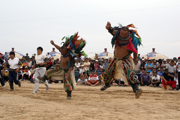 蒙古族摔跤(搏克)既不同于中國式摔跤,也不同于日本的相樸,其規(guī)則、方法、服裝、場地等方面都有自己的特點(diǎn)。比賽規(guī)則和方法是:不分等級(jí)(不分年齡、不分體重),沒有人數(shù)限制,只要是2、4、6、8、16、32、64、128等雙數(shù)即可。所有選手由德高望重的裁判負(fù)責(zé)編排配對(duì)或抽簽配對(duì)后上場。比賽實(shí)行單淘汰制,一跤定勝負(fù),失敗者不許再上場。每輪淘汰半數(shù)。裁判員發(fā)令后,雙方握手致意,然后開始交鋒,一般不限時(shí)間,可以采取勾、拉、踢、絆、推、抱、舉等各種方法和技巧,但不能抱腿摔,也不準(zhǔn)亂踢,更不能扯褲子,膝蓋以上任何部位著地即為失敗。摔跤手有專用服裝,上身為牛皮或帆布制成的緊身半袖坎肩“昭德格”,下穿肥大的摔跤褲,腳蹬蒙古靴,頸上套五顏六色的布條項(xiàng)圈。比賽場地簡單,只要有一片草坪或松軟空地,觀眾席地圍坐,摔跤手就可以在中間進(jìn)行比賽。賽前,雙方都有人高唱挑戰(zhàn)歌,以造聲勢。摔跤手入場、退場時(shí)都要模仿虎步或鷹步動(dòng)作,跳躍行進(jìn),威武雄壯。冠軍獲重獎(jiǎng),并在民間享有極高聲譽(yù)【圖為跳躍入場的摔跤手,劉軍攝影】。