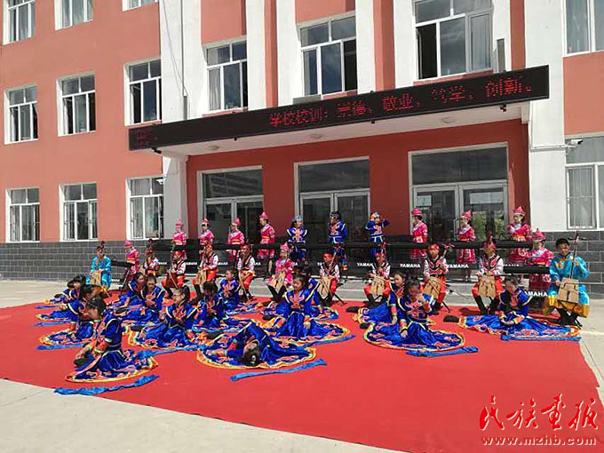農(nóng)牧民的孩子們在家門口的小學里也能接受到專業(yè)系統(tǒng)的藝術(shù)教育,圖為孩子們在進行才藝表演