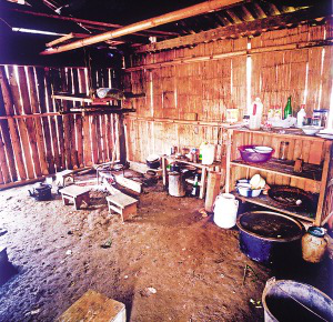 房內(nèi)一般隔成里外兩間,里間狹小,光線暗,是主人的臥室,只放雙人床和一小部分生活用品。外間寬大,是生火煮飯、聚會待客和子女就寢的地方?;鹛猎O(shè)在里間屋的門外,放鐵制三腳架,三腳架對應(yīng)的方位有固定的用途,即靠里間房門一方為主人的座位,靠外間房門一方為客人的座位,火塘上方靠墻處為子女的床位。如有成年子女和新婚夫婦,則在外間再隔出小間,里間和外間存放著生產(chǎn)用具和酒具。房內(nèi)幾乎沒有什么家具和裝飾性的陳設(shè),有的甚至沒有桌椅和床鋪,只在火塘周圍鋪著竹席或木板,合衣向火而眠?;鹛辽厦?米多高處懸掛著竹編的約1米見方的架子,上面放著食具、鹽巴、辣椒等,也是烘烤牛肉干的地方。架子上面靠房頂處并排放著幾個粗大的竹筒,里面存放糧食。這幾年的新村民居,在保持傳統(tǒng)民居特征的前提下使用了新型建材,更堅固,更舒適。