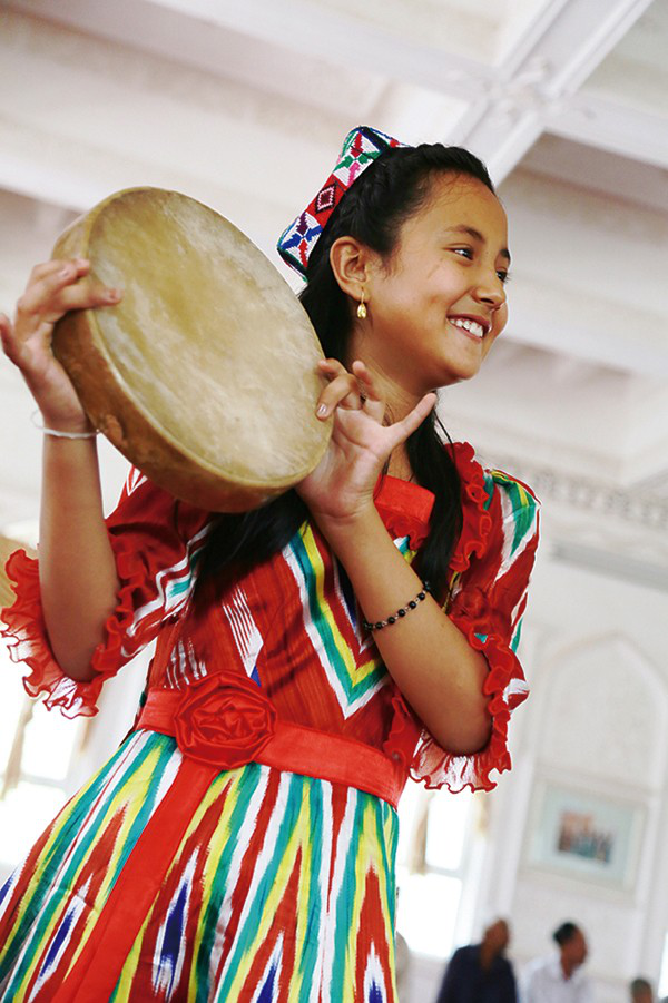 11歲的麥迪娜是小學五年級的副班長,在麥蓋提一小雙語班讀書,漢語好到可以給我做翻譯,向老藝人提問。麥迪娜的世界已經(jīng)和老藝人、和叢林中艱難漁獵的祖先不一樣了。她在麥西來甫中敲達甫手鼓,在活動中心學習電子琴,是女子“手鼓樂隊組合”中8位11—3歲女孩子中的一個。她希望將來能在北京上學、成為醫(yī)生治好奶奶的糖尿病。她會用漢語唱國歌和《歌聲與微笑》,還有《茉莉花》,雖然吐字與調子不太那么準。她圍著阿布都克萊姆(被稱作“維吾爾人的趙本山”的維吾爾族諧星)索要簽名的同時,還喜歡羅志祥,以韓國偶像組合EXO為榜樣。麥迪娜還上過電視,常有喀什地區(qū)的、自治區(qū)的、全國的媒體到麥蓋提來采訪、錄制刀郎麥西來甫。