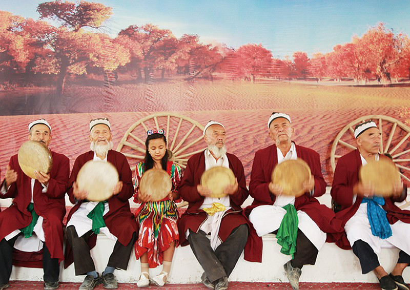 從麥迪娜9歲起教她達甫手鼓的是母親,把她打扮得漂漂亮亮的、去趕一場又一場麥西來甫的也是母親。作為央塔克鄉(xiāng)文化站站長,麥迪娜的母親整年都忙碌得要死。麥蓋提縣央塔克鄉(xiāng)以刀郎舞、農民畫立鄉(xiāng),觀光者多,活動多,任務多,接待多。它不僅是旅游之地,也是生活之地。麥迪娜的母親是位典型的維吾爾族女性,眉眼如刻,目光流轉,婚后迅速發(fā)胖。在一大群女人當中,她一定是最搶眼、最熱烈、最能干的那個。無論哪家舉行麥西來甫,都會邀請她。她總是提前到來,手腳麻利地幫忙,氣度昂揚地端桌布菜,熱情洋溢地放歌起舞。有時,母親也會提前帶麥迪娜到舉辦麥西來甫的家庭中,麥迪娜就會學母親的樣子,進廚房幫忙干活,直到麥西來甫開始,才換上衣裙,擠身樂師中間。麥迪娜沒有時間像其他孩子那樣,在鄉(xiāng)野、麥西來甫上盡情嬉戲,正如她的母親,只能將女兒的日常生活托付給奶奶照顧。