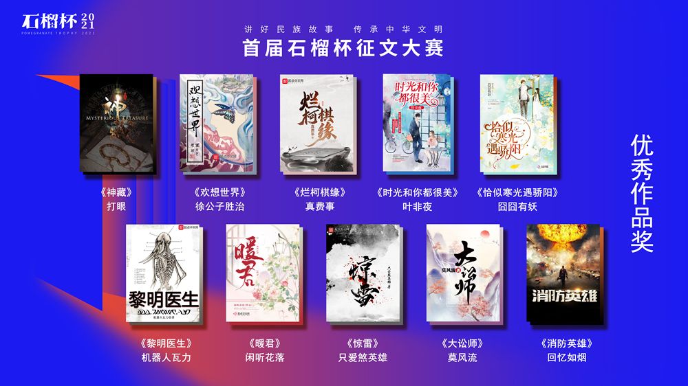 6月19日,民族題材網(wǎng)絡(luò)文學創(chuàng)作論壇暨首屆石榴杯征文大賽頒獎典禮在京舉行。作為國家民委主辦的“中華民族全家?!毕盗谢顒又唬讓檬癖魑拇筚惖玫搅藝颐裎幕麄魉竞椭袊贁?shù)民族文化藝術(shù)促進會的指導與支持,由閱文集團聯(lián)合天成嘉華文化傳媒、中國民族文化資源庫、中國民族文化資源網(wǎng)共同舉辦。本屆大賽以“講好民族故事 ,傳承中華文明”為主題,涌現(xiàn)出眾多弘揚民族精神、表達文化自信、傳播正能量的作品。經(jīng)過專家推薦及嚴格評審,《草原有座蒙古包》、《走西口之天山行》、《彩云微光》等三部作品獲“最具民族風采獎”,《神藏》、《歡想世界》、《爛柯棋緣》、《時光和你都很美》、《恰似寒光遇驕陽》、《黎明醫(yī)生》、《暖君》、《驚雷》、《大訟師》、《消防英雄》等十部作品獲“優(yōu)秀作品獎”。所有獲獎作品都將收錄入中國民族文化資源庫。中國作家協(xié)會副主席、書記處書記吉狄馬加表示,本屆石榴杯大賽是在黨和國家長期以來堅持的對民族文化、少數(shù)民族作家創(chuàng)作和民族題材創(chuàng)作的大力扶持下,依托網(wǎng)絡(luò)文學平臺,將文學作品與影視作品改編、游戲、動漫產(chǎn)品制作結(jié)合起來,探索的一條發(fā)展民族文化的新路,具有開創(chuàng)意義。