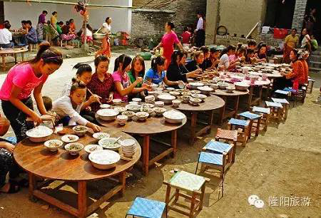 男方家也得請客。新郎啟程去接新娘子,家里馬上就殺雞做飯,新郎新娘回來后要吃染成黃色的糯米飯和雞肉,表示往后生活美滿幸福,像糯米飯一樣結(jié)成團(tuán)永不分開。晌午時分,是新郎家待客最熱鬧的時候,幫廚的人擺上各種酒菜,親朋寨鄰老老少少全坐到天井里,歡歡鬧鬧地吃飯。最后,客人們有的陸續(xù)走了,愿留下的湊攏幾桌,邊喝酒邊暢談,一直要吃到第二日還不歇。