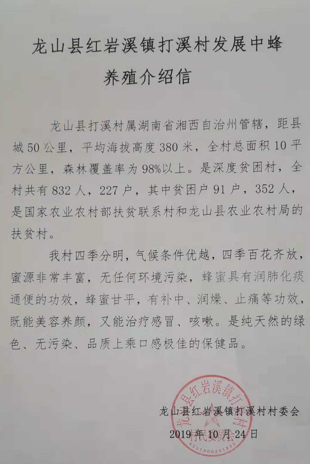 這里四季分明,氣候條件優(yōu)越,四季百花齊放,蜜源非常豐富,無(wú)任何環(huán)境污染。據(jù)湖南省湘西州龍山縣紅巖溪打溪村支部書(shū)記沈世平介紹:“我們這兒已經(jīng)有很長(zhǎng)的養(yǎng)殖蜜蜂的歷史,環(huán)境無(wú)污染,田土少,屬于純天然養(yǎng)殖,無(wú)農(nóng)藥,利于中蜂的養(yǎng)殖,并且在2019年4月份的時(shí)候,通過(guò)農(nóng)業(yè)部及農(nóng)業(yè)科學(xué)院的專(zhuān)家實(shí)地考察,認(rèn)證為最佳養(yǎng)蜂環(huán)境。今年獲得鄉(xiāng)政府幫扶,規(guī)劃從龍山縣中心養(yǎng)殖合作社引進(jìn)50箱進(jìn)行集中養(yǎng)殖,明年開(kāi)始分設(shè)4點(diǎn),一個(gè)點(diǎn)150箱,擴(kuò)大產(chǎn)量,并向全縣推廣。”