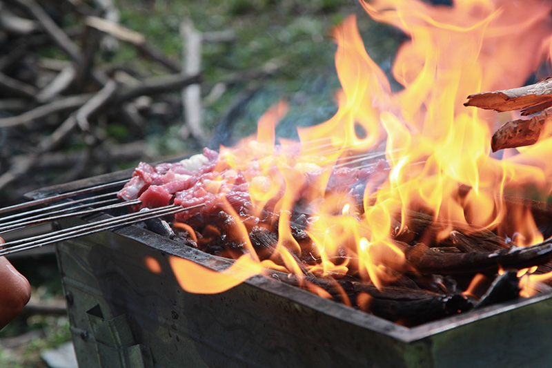 負(fù)責(zé)燒烤者將串好的肉串在水里蘸一下,再往長(zhǎng)形的白鐵皮烤串爐上一放,“刺啦刺啦”的油脂滴在炭火上,白氣與火苗齊竄,再往肉串上灑孜然、辣椒、鹽,一股藍(lán)色的香氣噴涌而出,撩撥著人們的味蕾。烤肉者兩手交替翻轉(zhuǎn),依經(jīng)驗(yàn)把握時(shí)間及火候,出爐前再均勻?yàn)⑸弦槐檎{(diào)料,這一大把烤肉就出爐了。