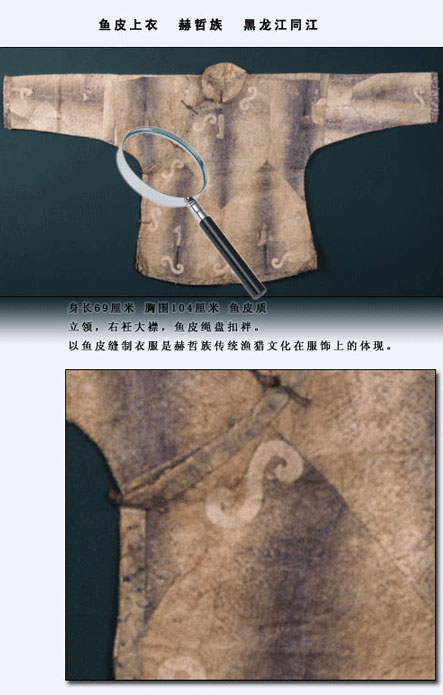赫哲族的魚皮衣歷史久遠。我國古代文獻《山海經》第九卷《海外東經》中便有“玄股之國,在其(黑齒)北,其為人衣魚食鷗” 的記載?!耙卖~”西晉學者郭璞解釋為“以魚皮為衣也?!闭f明早在兩千多年前,赫哲族的先民就已使用魚皮做衣服了。另據密山新開流新石器時代遺址中出土的魚叉及骨針,證明赫哲族的先民捕魚和縫制魚皮衣有數千年歷史了。清代張晉彥的《寧古塔山水記》有:“魚皮部落,食魚為生,不種五谷,以魚皮為衣,暖如牛皮”的記載?!痘是迓氊晥D》記載:“赫哲衣服多用魚皮而緣以色布,邊綴銅鈴,亦與鎧甲相似。”另外,地方志書對此也多有記載??梢姡照茏逯谱骱痛┲~皮衣是真實而久遠的。