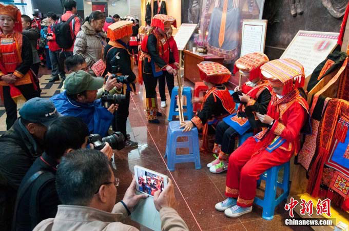 12月6日,在中國(guó)瑤族之鄉(xiāng)廣西金秀瑤族自治縣的盤(pán)王節(jié)上,當(dāng)?shù)乩弦惠叕幾鍕D女展示瑤族織繡