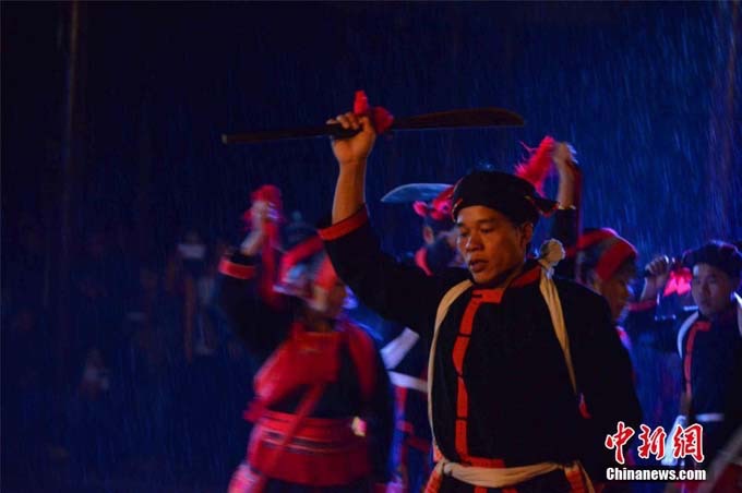 12月6日夜晚,在中國(guó)瑤族之鄉(xiāng)廣西金秀瑤族自治縣瑤族百姓在盤(pán)王節(jié)上,展現(xiàn)當(dāng)?shù)噩幾迕耖g絕技——下火海