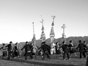 登窩羅時(shí),領(lǐng)唱的人在前,這人叫“稍干”。其他人雙手叉腰,跟著稍干唱。邊唱邊大蹲大跳,一會(huì)兒背對(duì)背,一會(huì)兒面對(duì)面。春節(jié)圍著窩羅牌坊跳,平時(shí)圍著一張擺滿煙酒茶果的桌子跳,意思是圍著太陽、月亮轉(zhuǎn)。