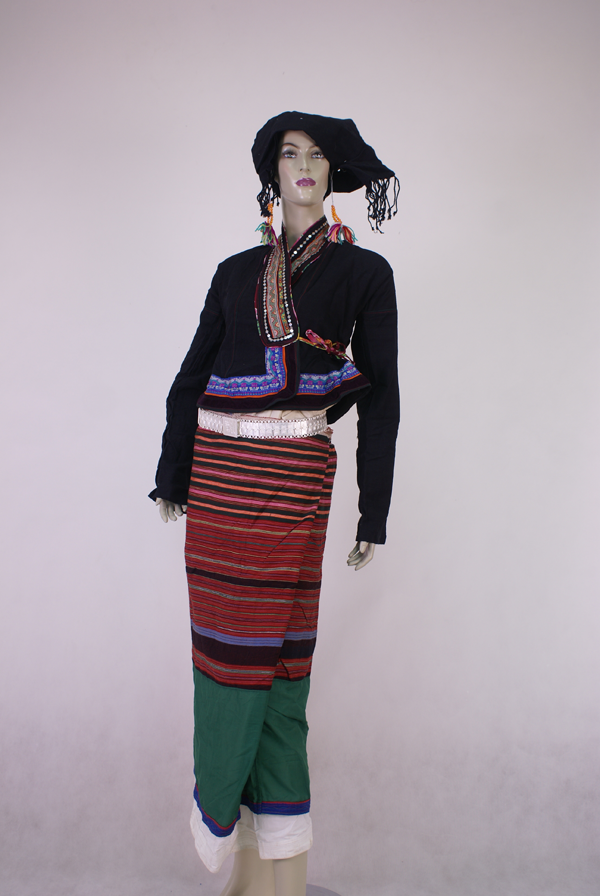 婦女的衣裙與傣族相似,上穿緊身短衣,頭頂挽髻,用頭巾纏頭,喜歡戴大耳環(huán)、銀手鐲等裝飾。姑娘愛戴野花或自編的彩花,將雙頰染紅。一般,女子上著左右兩祚斜襟窄袖黑色小褂,小褂為圓領(lǐng)、緊腰、寬擺,短及臀部,在左肋下拴線打結(jié),已婚婦女用黑色布料,未婚姑娘喜淺藍色或白色。里衫為無袖貼身夾衫,下穿兩條筒裙,內(nèi)裙為白色,外裙有兩色,臀部以上為紅色橫條,腿下為綠色或黑色,用布條或花邊鑲飾。未婚婦女用黑或藍布包頭;已婚婦女梳發(fā)髻,插銀簪,頂端鑲3顆棱形玻璃珠,下系銀鏈,纏包頭。婦女戴銀耳環(huán)、項圈、手鐲等飾品。