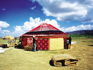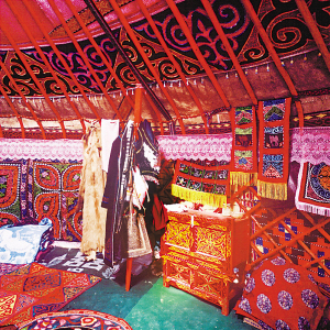 氈房外觀通常樸實(shí)無(wú)華,門框由松木做成,上面雕刻花紋或繪制圖案,一塊鮮艷奪目的掛毯吊在門上。房?jī)?nèi)富麗堂皇,布置合理,前半部分堆放日用物品,后半部分待客、住人。