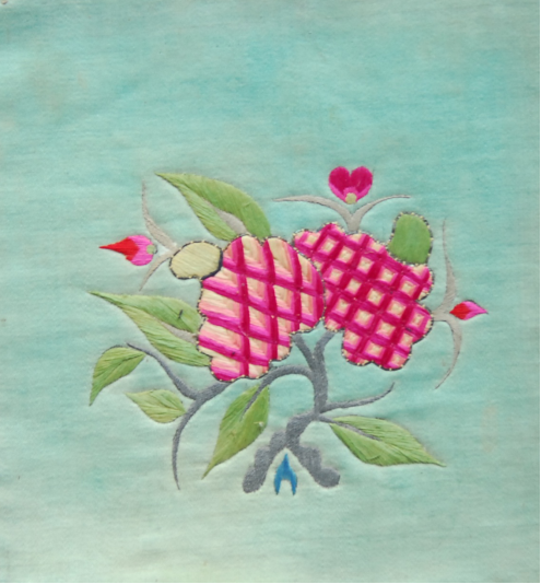 1.平針繡,又稱“直針”,是滿族枕頂刺繡最基本的針法之一,它能準確地表達植物花卉、動物禽獸、人物、器物等。在所有針法中,平針是分布最廣、使用范圍最大的針法。它的運針方式是起針、落針都在圖案的輪廓邊緣,針腳排列均勻,線跡平行,不重疊交錯,紋樣之間的線條靠空出地面來表現(xiàn)。