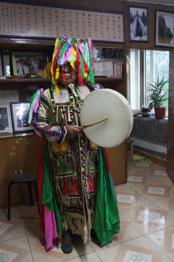 冬天穿的鞋是“奇哈密”和“溫得”,“奇哈密”是用狍脖皮或犴皮做靴底,用狍腿皮拼縫成靿的短靴?!皽氐谩笔怯寐够蜥砥ぷ龅祝够蜥硗绕て纯p成靿的長(zhǎng)靴。“溫得”因?yàn)殪壐?,冬天穿著打獵不易灌雪。這兩種靴子都要用冬季絨毛狍皮做成的襪子配套穿用,暖和跟腳,踩在雪地上沒(méi)有聲響。夏天一般穿“奧勞其”,是一種皮底布靿短靴。“考呼落”,是用冬季絨毛狍皮縫制的二指手套,掌面腕部留一縫口,手從縫口中伸出,手套仍護(hù)在手背上,既使在零下40度的嚴(yán)寒中處理獵物,也不用擔(dān)心手被凍壞。還有一種五指狍皮手套,背面正中繡花、蝶等中心圖案,五指的關(guān)節(jié)和指甲處繡出各種小型圖案,然后用連理枝將中心圖案和關(guān)節(jié)、指甲圖案連為一體,中心圖案代表手掌,手指圖案代表關(guān)節(jié)和指甲,連理枝代表骨骼和血脈(圖為越來(lái)越鮮見(jiàn)的薩滿服飾,吳雅芝供圖)。