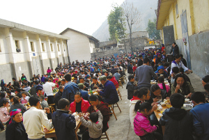 每年秋收后到翌年播種前,是四川涼山金陽縣人結婚的黃金季節(jié)。無論是在縣城還是農村,不管是吃“九斗碗”,還是吃“坨坨肉”,大家都喜歡擺壩壩宴。在金陽縣城,常??梢钥吹竭@樣一幅景象:數百人聚在一處,圍坐于一張張方桌旁,伸箸暢食,舉杯暢飲。一盆盆肉端上桌子,主人不停地招呼客人趁熱吃?! ?/p>