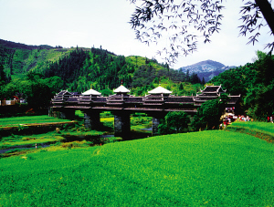 程陽永濟(jì)橋始建于民國初年,集橋、亭、閣、樓、臺于一身。橋墩石塊砌成六面柱體,墩上設(shè)兩層原木托架梁,托架上建有5座塔閣式橋亭和19間橋廊。橋廊為木結(jié)構(gòu),上覆琉璃泥瓦,對稱分布,中間為六角攢頭重檐亭。整座橋和諧得體,如游龍翹首,鳳凰展翅。它與我國的趙州石拱橋、瀘定鐵索橋、羅馬尼亞鋼梁諾瓦沃橋并稱為世界四大歷史名橋。