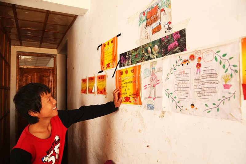 小家伙們帶著我,去看父親利用核桃樹做的蜂巢,看村里集中修建的豬圈,看自家的舊屋——廢棄的木楞房已改為雞、兔的家。而龍家的新居,有院子、伙房和住屋。住屋有三間,客廳墻上貼滿了獎狀,它們都屬于龍初杰。這些獎狀的正中間是幅兒童畫?!拔业钠谀┳鳂I(yè),這張《我的家》沒舍得交,又另外畫了一張《獨龍江風光》交給了老師。”畫中有新家、豬舍、水泥路、蜂房、發(fā)電機、小狗,以及國旗。