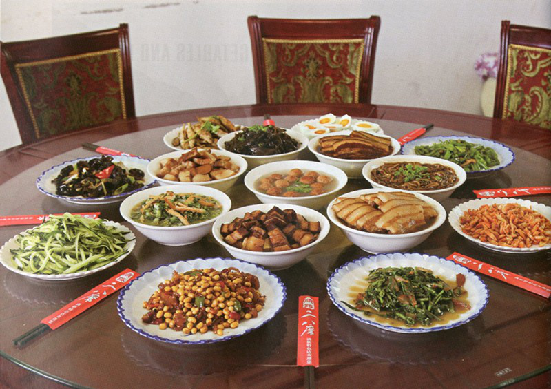 “二八席,八個(gè)盤、八個(gè)碗,八盤涼菜、八碗熱菜,講究葷素搭配,涼菜以時(shí)令蔬菜為主,可隨季節(jié)自由搭配,熱菜相對固定,即為紅木梳背和白木梳背、紅剪子和白剪子?!崩铠P友像說順口溜一樣道出了二八席的基本構(gòu)成。