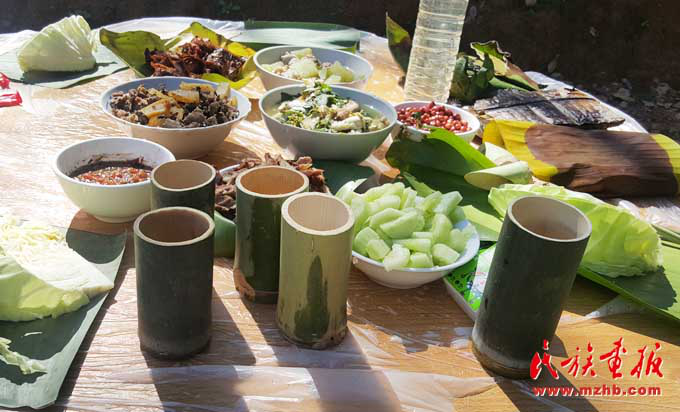 基諾族地區(qū)食材豐富,一日三餐,以大米為日常主食,雜以玉米、瓜豆等。每年5—9月的雨季,基諾山漫山遍野是食材,山藥、水芹菜、竹筍、魚腥草及各種菌類等無污染且很新鮮,是難得的烹飪材料,經(jīng)過簡單處理就成為餐桌上的美味佳肴?;Z族民間有句俗話,叫“漢炒、傣蘸、基諾舂”,也就是說漢族人喜歡吃炒菜,傣族的菜喜歡蘸著調(diào)料吃,基諾族的菜則以臼舂為主。基諾族的肉類的吃法較多,可以腌成干巴,也可吃新鮮的。酸腌魚、涼拌茶也是基諾族的最愛,基諾人做飯就餐均在竹樓二層的火塘周圍進(jìn)行,有一定的禮節(jié)和講究?;Z族吃飯時(shí),主人首先要在火塘東側(cè)獻(xiàn)一點(diǎn)飯菜祭祀祖先和灶神,吃飯時(shí)全家人按順序在火塘旁圍蔑桌而坐,家長正對(duì)火塘,客人靠火塘而坐。