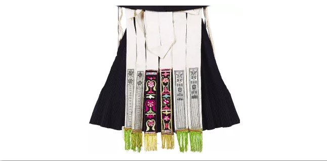 與北方少數(shù)民族圍腰的簡練大氣相比,南方少數(shù)民族的圍腰則更顯秀美精細(xì),且常常佩戴前后兩塊圍腰。貴州開陽地區(qū)苗族女子的盛裝造型,就包含了層疊式前圍腰和飄帶式后圍腰:前圍腰分為5層,每層皆以數(shù)紗繡為主要裝飾工藝,結(jié)合絳子邊與金屬裝飾線,并用棉布進(jìn)行包邊處理,圍腰面積較大且重量較沉,穿著時系在上衣與坎肩之外,上端兩角自然下翻。后圍腰以本白色棉布為料,分為6條飄帶,裝飾部位集中于飄帶下方,其中左右兩對飾有數(shù)紗繡,中間一對則為黑地彩色平繡,飄帶底部還縫綴彩色流蘇,頗具動感。細(xì)致的手工裝點出苗家女子之貌美,也彰顯著苗家女子之手巧。