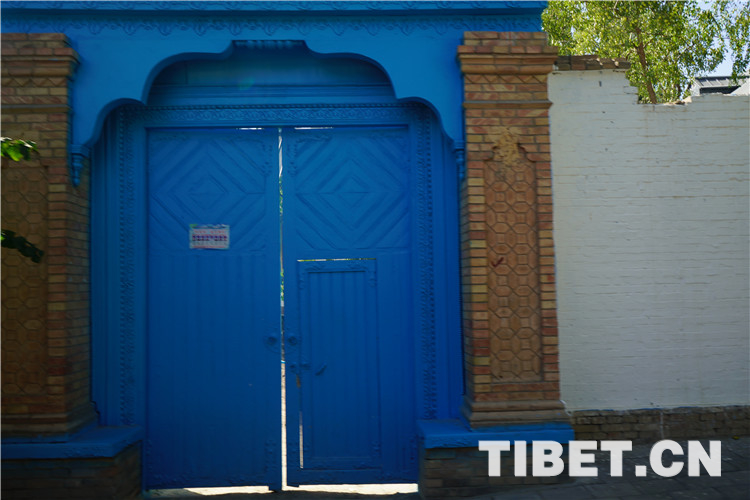目前,喀贊其仍保留著一定數(shù)量的文物古跡,包括自治區(qū)級文物保護單位1個(陜西回族大寺),市級文物保護單位7個,另有12處清真寺建筑。圖為具有當?shù)靥厣呐R街藍色大門。