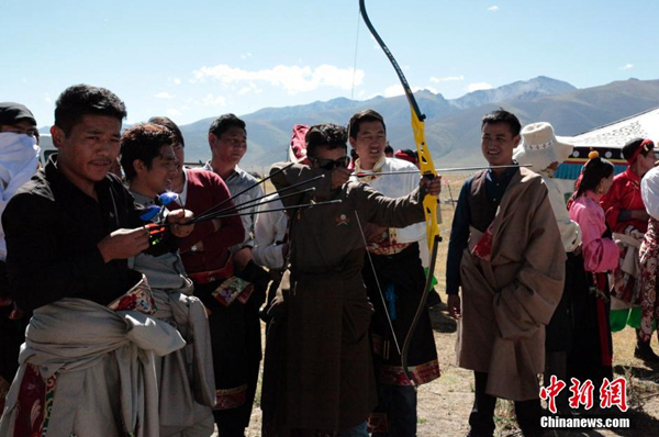 圖為青海省玉樹(shù)藏族自州當(dāng)?shù)孛癖娺M(jìn)行射箭比賽來(lái)慶?!般逶」?jié)”到來(lái)。來(lái)源:中新社 攝影:孫睿