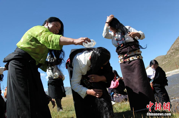 37歲的藏族青年旦增跟記者開(kāi)玩笑,“自己看上去比實(shí)際年齡年輕,就是因?yàn)槟昴甓紒?lái)沐浴?!彼X(jué)得藏族民眾初秋過(guò)“沐浴節(jié)”,能夠提高抵抗力,與內(nèi)地所講的“春捂秋凍”本質(zhì)相同。旦增介紹說(shuō),不能在流水中過(guò)“沐浴節(jié)”的藏族民眾,會(huì)在月光照過(guò)的盆中凈水洗頭。