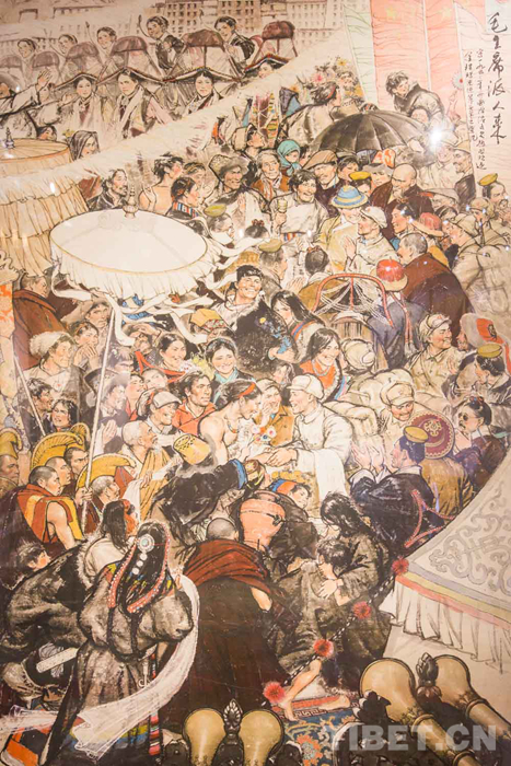 鑒賞展現(xiàn)場(chǎng),不少前來(lái)參觀的畫家都是韓書力的學(xué)生或在一定時(shí)期曾受其教導(dǎo)。“1973年,我在西藏自治區(qū)展覽館見(jiàn)到了韓書力老師,第一次見(jiàn)面我就拜了師。我們一起下鄉(xiāng),我就給他當(dāng)導(dǎo)游和翻譯。30幾年來(lái),我一直在學(xué)習(xí)韓老師的繪畫技法,到現(xiàn)在還是他的學(xué)生。韓老師創(chuàng)作《毛主席派人來(lái)》時(shí),我就跟在旁邊學(xué)習(xí)。學(xué)到了一些創(chuàng)作獨(dú)幅作品的技巧和手法,讓我受用至今?!蔽鞑厍嗄戤嫾矣?jì)美赤列說(shuō)。