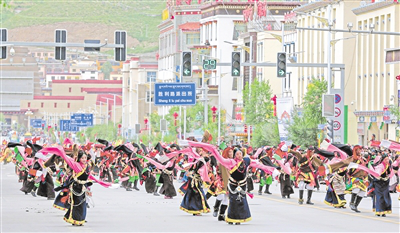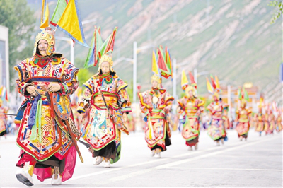 2017年7月24日下午,一場名為“瀟灑的康巴人”玉樹風情巡游在玉樹藏族自治州州府玉樹市街頭上演。來自玉樹州一市五縣的康巴藏族兒女或馭駿馬、或盛裝、或歌舞,以行走巡游的方式展示當?shù)鬲毦咛厣拿褡迕袼孜幕8骺h巡游隊伍從感恩廣場出發(fā),途徑結古大道、民主路,最終到達玉樹軍分區(qū),沿途圍滿了觀看的群眾和游客,據(jù)悉,此次巡演在玉樹州尚屬首次。