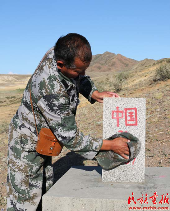 馬合沙提 ·斯拉木精心維護界碑(趙利 攝影)