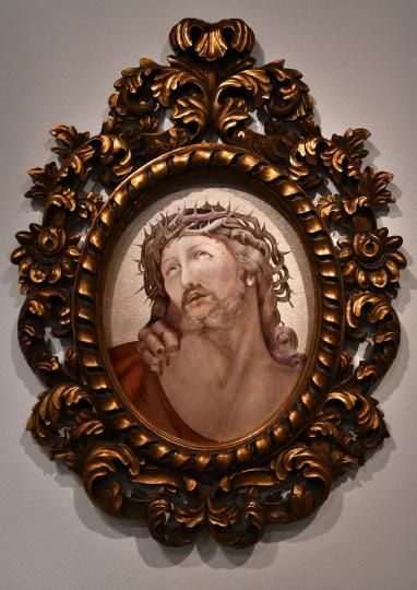 本作品展現(xiàn)的是耶穌被釘在十字架上遭受殘酷折磨的神態(tài)。作者用亂針繡和平繡相結合的方法,用細密的排針將耶穌的苦難放大在觀者面前。整個繡面呈現(xiàn)出了靜默而肅穆的氛圍。