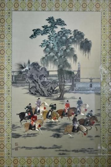 取材于后梁畫家趙喦所作《八達游春圖》。八人策馬揚鞭于草地間,前者呼,后者應。絲縷排列精致細膩,人物五官不逾寸豆,卻被精巧的一一繡出,神情各異,極為傳神。