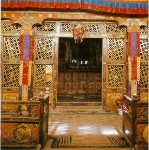 大門由于它的位置所在不應(yīng)該列入室內(nèi)裝飾,但它與室內(nèi)裝飾息息相關(guān),連成一體,故我們把它當(dāng)作室內(nèi)裝飾在這兒加以介紹。門框裝飾包含門框本身、門楣、門楣上的屋檐、門板等。藏族建筑大門裝飾十分講究,從屋檐到門坎都用雕、繪的手段充分加以裝飾。屋檐用兩道方本間隔排列,上蓋青石片和黃土筑成底小頭大的形狀,它不僅有美觀的裝飾效果,而且起到防水作用。屋檐下是門楣,門楣上彩繪各種圖案,門框的木構(gòu)件上雕刻蓮花花瓣和累卷疊函凹凸方格圖案,這種圖案處理形式大部分民居大門大同小異。門板為單開式,板門為了加固起見上、下分層釘鐵條。門板一般涂單一色,不作繪畫處理。除了這些裝飾以外,門相上掛短縐簾,門框左右邊緣墻上涂兩道黑色豎條,每年過年前短縐簾要棄舊換新,黑色豎條與粉刷外墻一道重新涂漆,這是一般民居門框裝飾。寺廟門框裝飾較為復(fù)雜,門楣的間隔方木上加一層雕刻動物頭像的木雕作品排成一行,裝飾門楣這一板塊,門框木構(gòu)件多則六、七層,層層雕刻各種圖案,可見其講究程度。寺廟門板大多是對開式,用鐵條包裝門邊緣,中間分層釘鐵條,涂一層單一的顏色,特殊殿堂如擴法神殿大門門板上要進(jìn)行繪畫處理,寺廟大門講究厚重、莊嚴(yán)。無論是民居大門還是寺廟大門,其裝飾要求與室內(nèi)梁柱裝飾相協(xié)調(diào),從顏色的運用到雕刻內(nèi)容都要做到這一點,保持內(nèi)外裝飾效果統(tǒng)一。