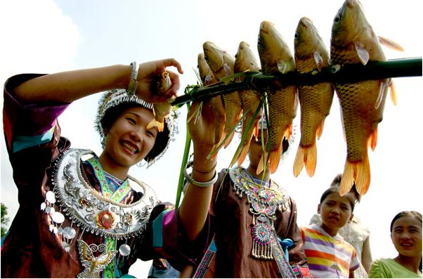 燒魚是廣西融水苗胞的習(xí)俗之一,融水的苗族同胞素有在稻田里養(yǎng)魚的習(xí)慣,每年春插,苗家人向來喜歡在稻田里放養(yǎng)鯉魚。每年的秋收稻黃時節(jié)也是田鯉肥壯之時,這時來自四鄉(xiāng)八寨眾多的各民族兄弟便匯聚起來,點燃一堆堆篝火,燒田鯉吃野餐,盡享豐收喜悅。燒魚從9月稻黃收割開始持續(xù)到12月底才正式結(jié)束,故名“元寶山金秋燒魚季”。燒魚季節(jié),苗寨家家戶戶釀起醇濃的甜酒,蒸著香噴噴的糯米飯,帶上食鹽、辣椒、蒜苗、蔥花、薄荷等佐料上山去剪禾。晌午時候,他們在田頭或田邊的平地?zé)鹨欢讯洋艋?,從田里抓來一籠籠活蹦亂跳的鯉魚,用樹枝或竹片把魚一條條串起,排成一排,然后放在紅彤彤的火炭上翻來覆去地烤,大約半小時左右,魚被烤炙得“呲呲”作響,水分烤干,慢慢地變黃,直至熟透,香飄四溢,遠(yuǎn)遠(yuǎn)就可聞到香味。
