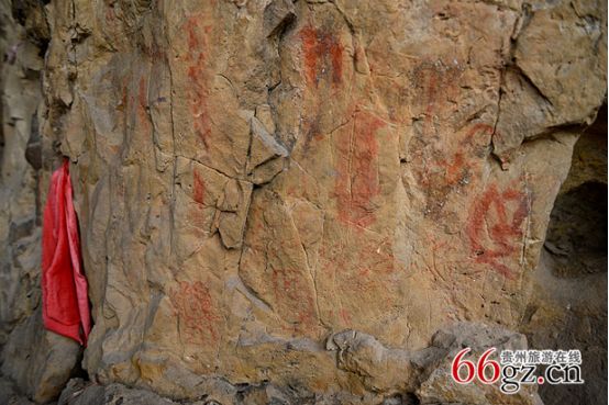 同時,在金山洞壁上的清代壁題也數(shù)量眾多,既有題詩,又有紀(jì)事,還有祝文,分別題于清乾隆、道光、咸豐年間。明顯可見“貴州貴陽府”和“貴陽府廣順州”等字樣。還有1949年以后的毛主席語錄,均以赭色書寫。據(jù)說時至今日,仍有村民在巖下洞口焚香秉燭,寄拜巖神,祈禱康健。現(xiàn)在在巖石上還能看到祈福的紅布和被煙火熏黑的巖洞。