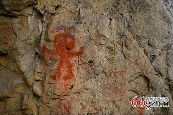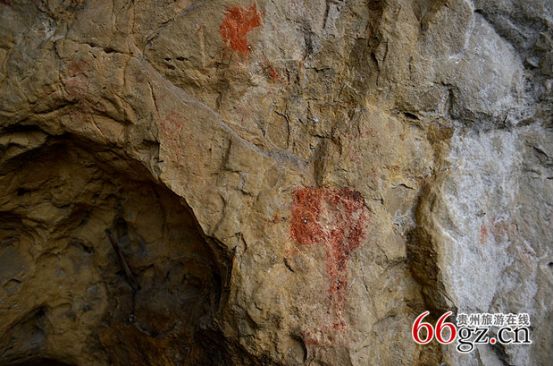 據(jù)資料載,金山洞古代崖畫以赭色涂繪人、馬、狗等等,隱約可見形態(tài)各異的大小圖像二三十個。人物多作行走狀,亦有雙手高舉者,似乎在祈禱。從其畫風(fēng)觀察,與相距不遠(yuǎn)的省級文物保護(hù)單位--長順龍家院崖畫十分相似。