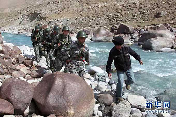 拉齊尼·巴依卡與紅其拉甫巡邏官兵騎著牦牛巡邏。(新華社記者 李翔 攝影)