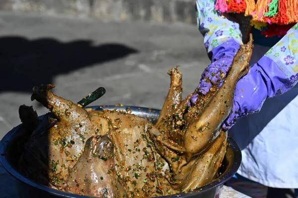 腌漬的時(shí)間越長(zhǎng),調(diào)料越能入味,揉好鹵汁,還要腌制個(gè)把小時(shí)。房屋后面,也是一派繁忙的景象,挖土坑,摔膠泥,大家都在為這一道隆重的美食做著準(zhǔn)備工作。全羊用野芭蕉葉、草果葉或大粽葉、大竹葉捆裹停當(dāng),用膠泥裹糊嚴(yán)實(shí),挖一土坑,先放入一堆柴火燒起,把土坑徹底燒熱,再把土包羊放到土坑里,土包羊上下左右堆放滿柴火開始燒烤,約2小時(shí)后,木柴全部化為灰燼,然后刨土覆蓋嚴(yán)嚴(yán)實(shí)實(shí),不能透氣絲毫。