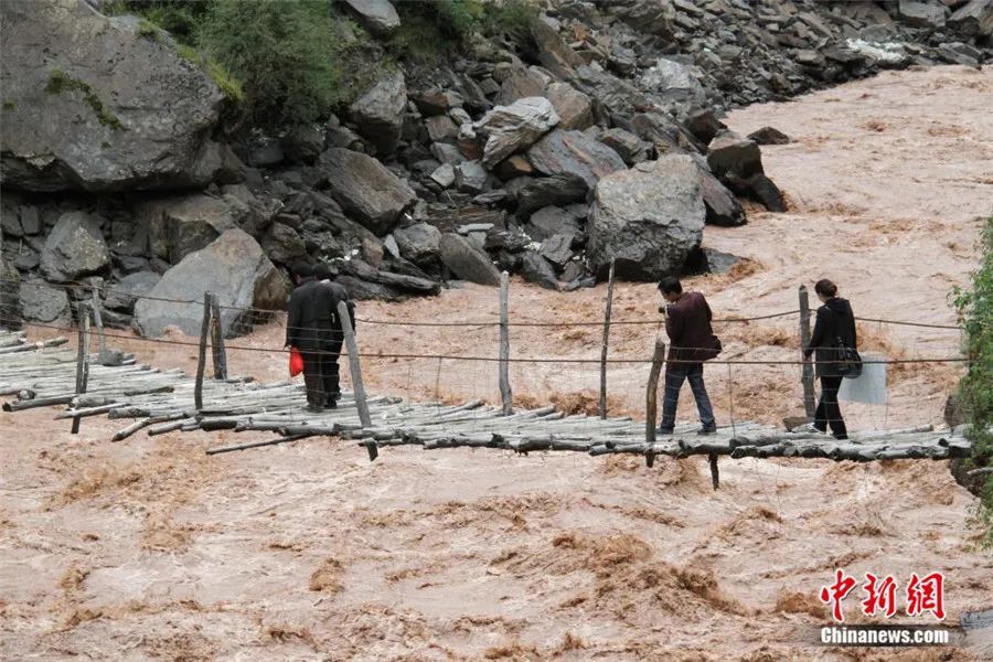 2014年,工作人員赴那曲比如縣進行古籍普查,經(jīng)過怒江上一座簡易浮橋。受訪者供圖。