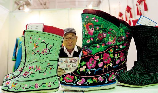傳統(tǒng)的氈繡工藝品包括吉祥圖案、花紋圖案、五畜圖案、鮮花飛鳥(niǎo)、蒙古包門、氈包帡幪、馬鞍屜、氈靴(氈襪)、坐墊、各種繡花氈囊、拾羔袋、駝鞍等。