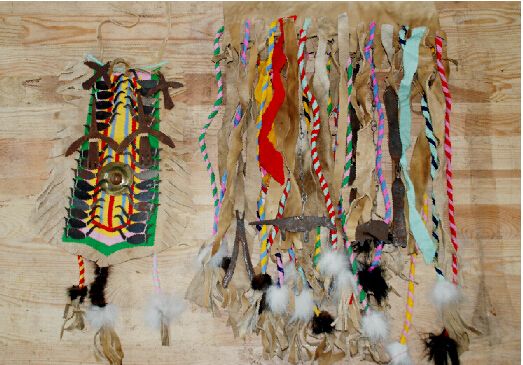 腰裙下擺的前后配戴著50個(gè)銅鈴,以此代表眾多神靈的福音。腰裙上還系著一對(duì)熊神和一對(duì)狼神偶體,因?yàn)槎鯗乜巳苏J(rèn)為熊是人類(lèi)的祖先,人們不能輕易傷害獵取,如果一旦打死熊,也要對(duì)熊骨進(jìn)行風(fēng)葬。而狼據(jù)說(shuō)是神靈的兒子。這些又都可見(jiàn)薩滿信仰又與鄂溫克人在原始社會(huì)條件下的自然崇拜、祖先崇拜有著非常緊密的淵源關(guān)系。