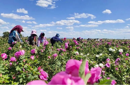 在阿舍鄉(xiāng)清香玫瑰合作社的玫瑰花茶基地里,玫瑰花姹紫嫣紅,爭奇斗艷,美不勝收。為了搶抓玫瑰花采摘最佳時間,花農(nóng)早晨5點多就已經(jīng)忙活起來,他們穿行于花海之間,背著籮筐興高采烈地采摘今年的第一波玫瑰花。